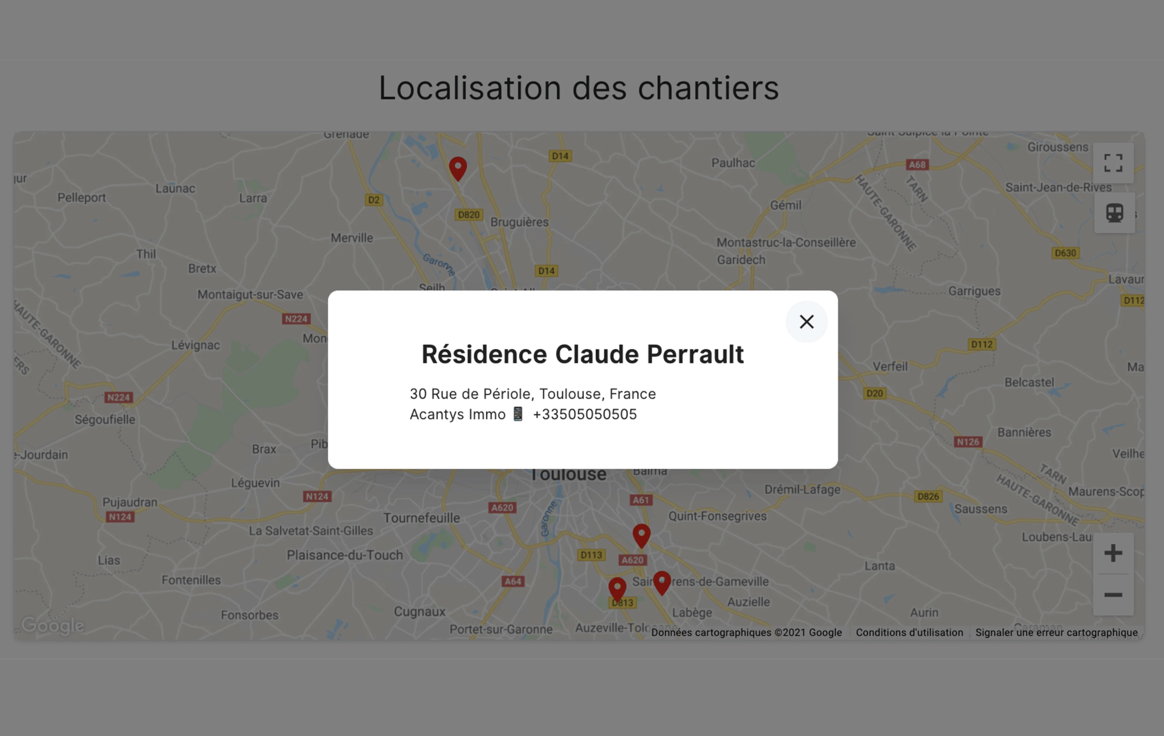 Par exemple : si Marie et Paul font partie du même Groupe et qu'ils ont renseignés 2 chantiers chacun, alors 4 marqueurs apparaîtront sur la Carte. \